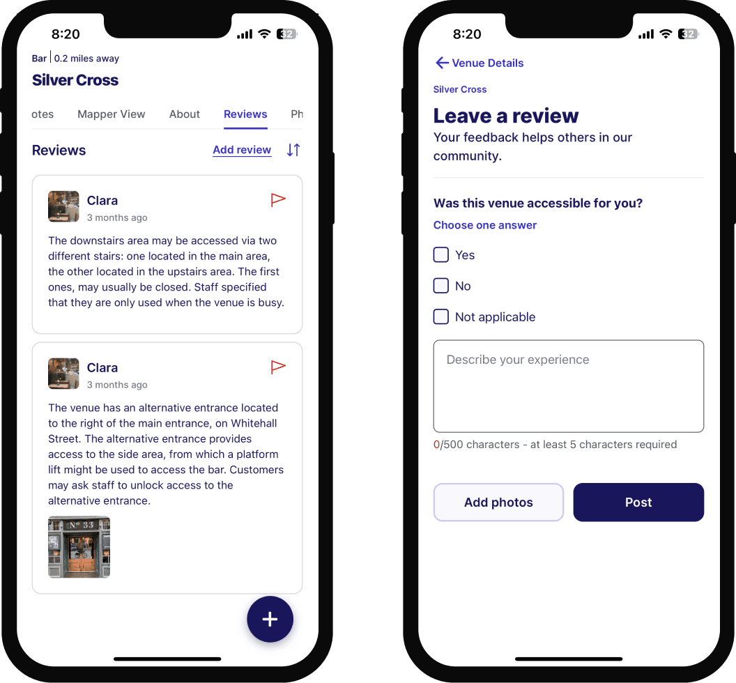 Review are where you can add those details about your experience at a venue which were not captured in the tags or photo sections. We encourage users to share their first-hand experiences, as focused on the accessibility of the venue (eg. you can leave out the flavour feedback!)